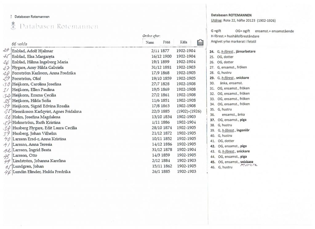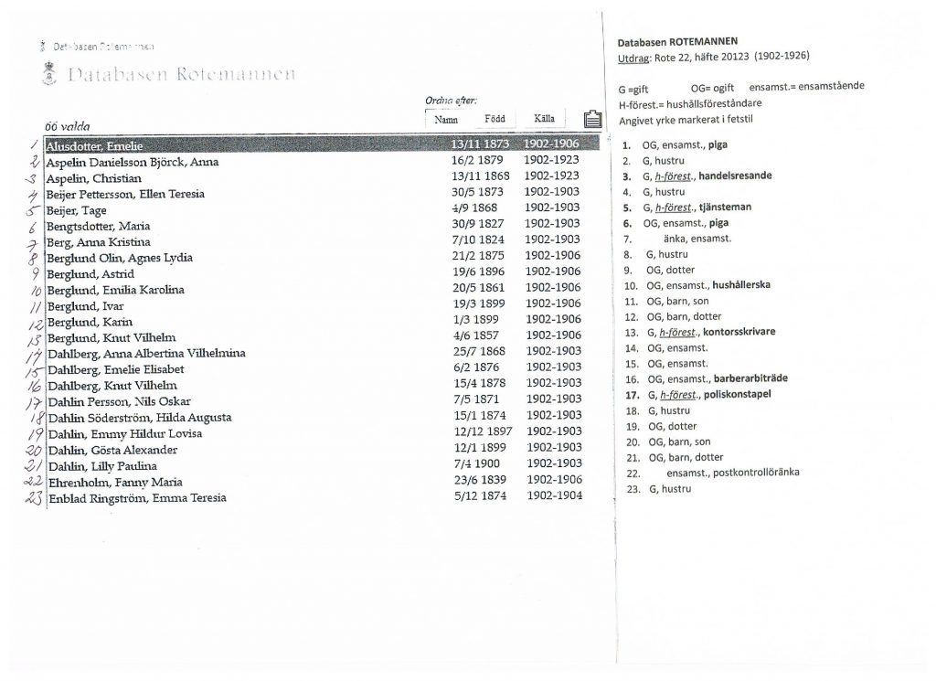 Av längden framgår att de boende vid denna tidpunkt tillhörde Adolf Fredriks församling, och ursprungligen den sk Norrtullsroten. Av bifogat utdrag (vänster spalt) kan man även se under vilka år de var bosatta i fastigheten (anges i Rotemannen endast ett år, ex. ”1902”, betyder detta att personen helt eller delvis bodde i huset under året). Angiven sysselsättning har lagts till för hand (höger spalt), då det ej är möjligt att återge samtliga uppgifter på ett blad!