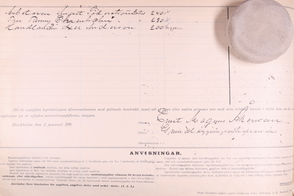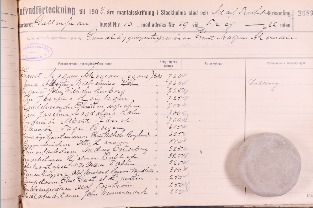 I flertalet fall uppfördes Stockholms fastigheter i syfte att hyra ut lägenheter, så även här. Som vi redan sett, flyttade byggherren (Ernst Magnus Åkervall) in i huset och kan som ägare återfinnas i Databasen Rotemannen 1902 under beteckningen ”ogift, ensamstående”, till yrket ”grundläggare”. Han var då 44 år gammal. – Hans kunskaper som entreprenör hade följaktligen kommit oss mer än väl till pass vid den gårdsrenovering som hans fastighet skulle genomgå drygt hundra år senare!