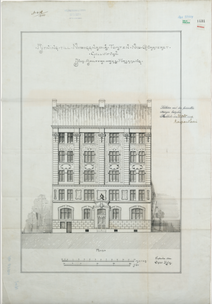 Fasadritning, Oscar Holm, 1900, Fastigheten Gullvivan 10, Frejgatan 89 (dåvarande 69), Vasastaden, Stockholm. Av Stockholms Stadsmuseum (grön)klassad, kulturhistoriskt värdefull fastighet uppförd 1900-1902.