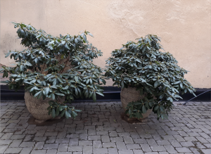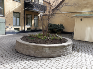 Fastighetens gård kom 2013 att behöva en grundförstärkning (bjälklag), vilket påföljande år gav möjlighet ersätta den tidigare asfalteringen med en mera klassiskt utformad stenbeläggning (grå marksten). Samtidigt anlades en cirkelformad plantering i gårdens mitt, till vilken ett vårdträd anskaffades. Detta kom att efterträda ett tidigare avhållet plommonträd; det var förr inte helt ovanligt med fruktträd på innergårdar. Planteringen kompletterades med ett antal terracottaurnor, placerade i gårdens fond och sida.